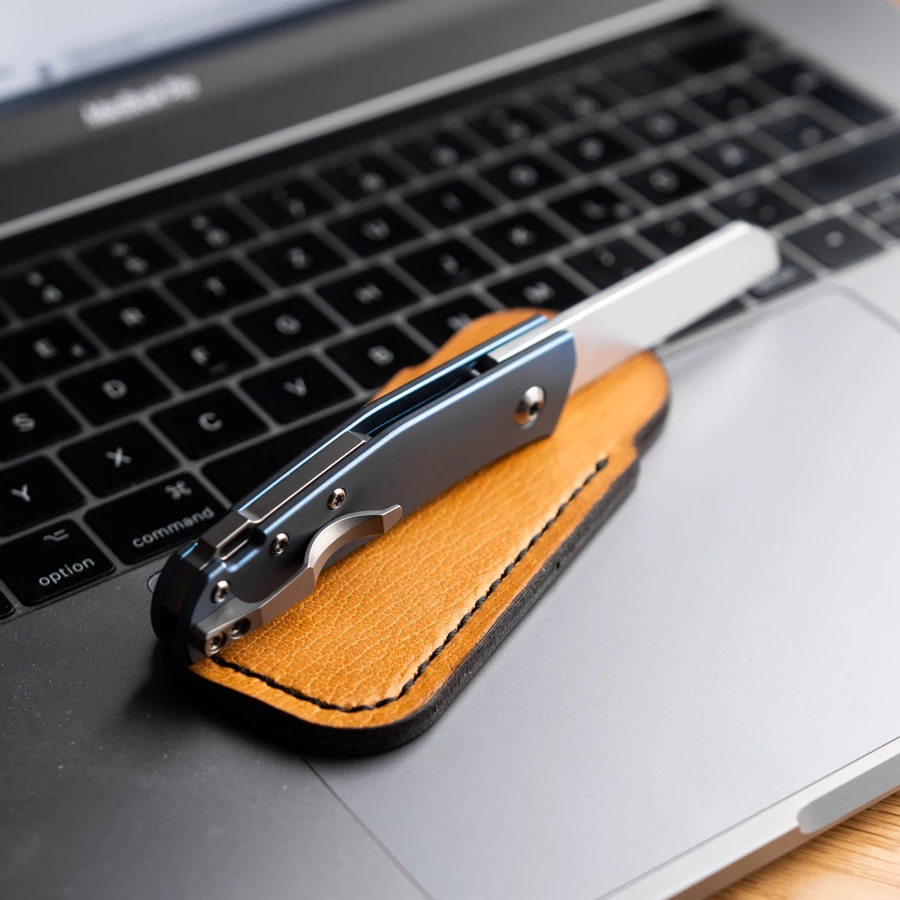Jens Anso has once again thought about how he can improve the Monte Carlo. The result is new titanium screws, a uniform width of the handle scales, and even better and more precise machining processes. Your Monte Carlo comes with a small leather sheath that protects the surface from scratches when you just want to put the knife in your pocket.