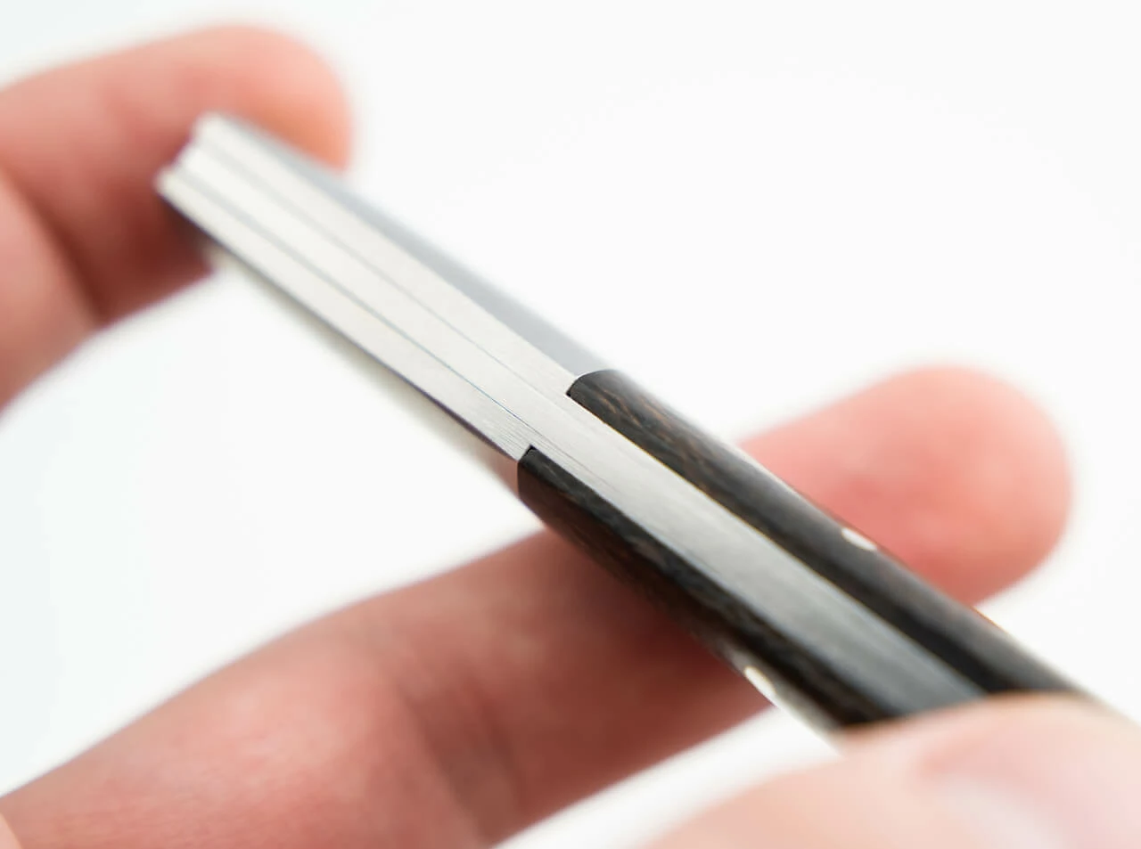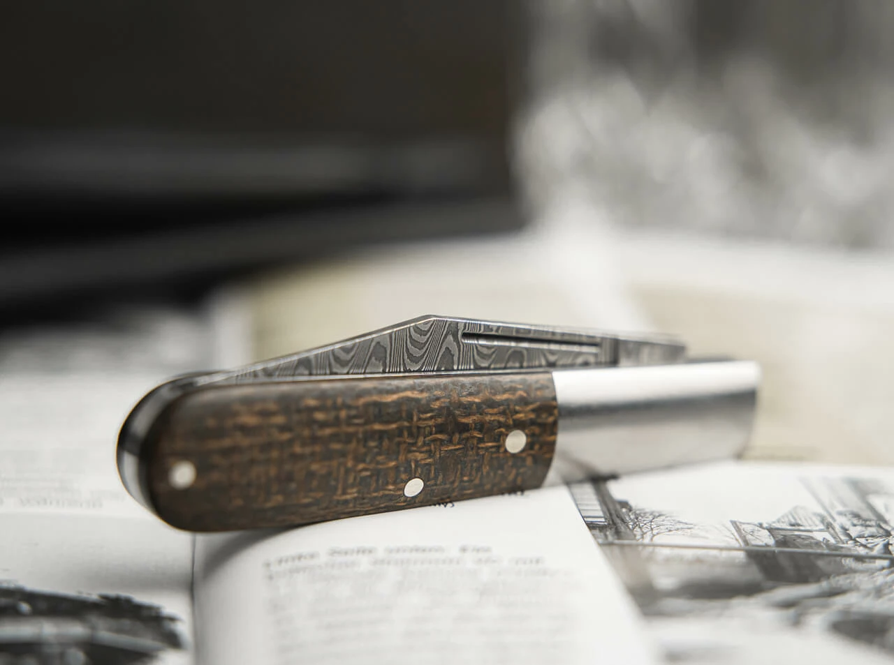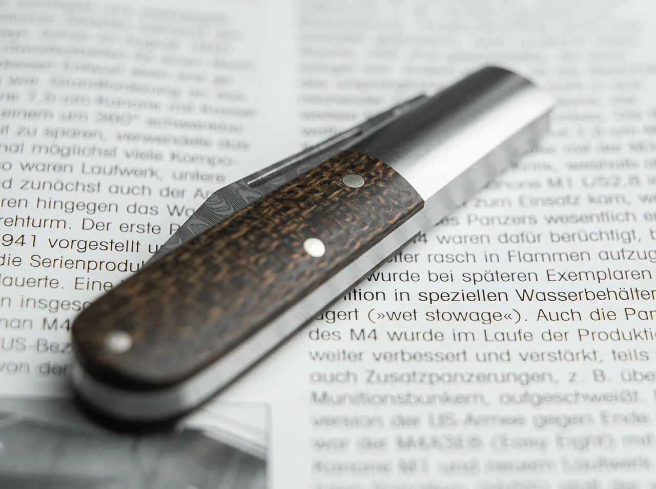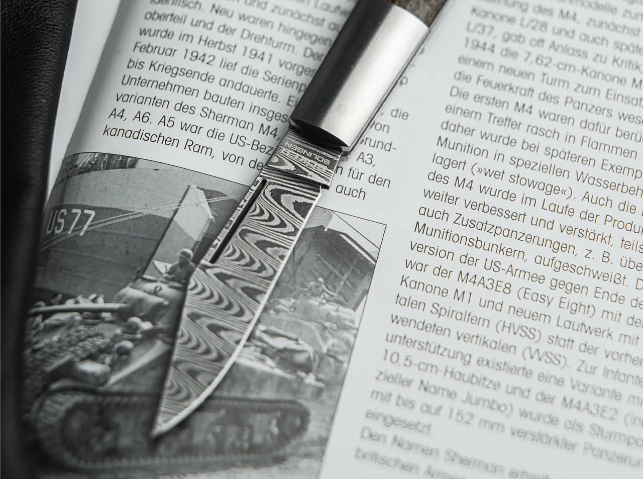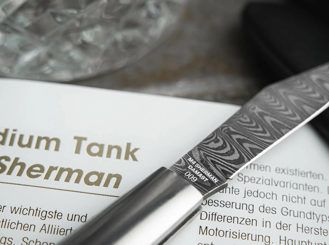 - the damascus of 80 layers is reminiscent of tank tracks(forged by hand by Chad Nichols in the pattern Customized Ladder)