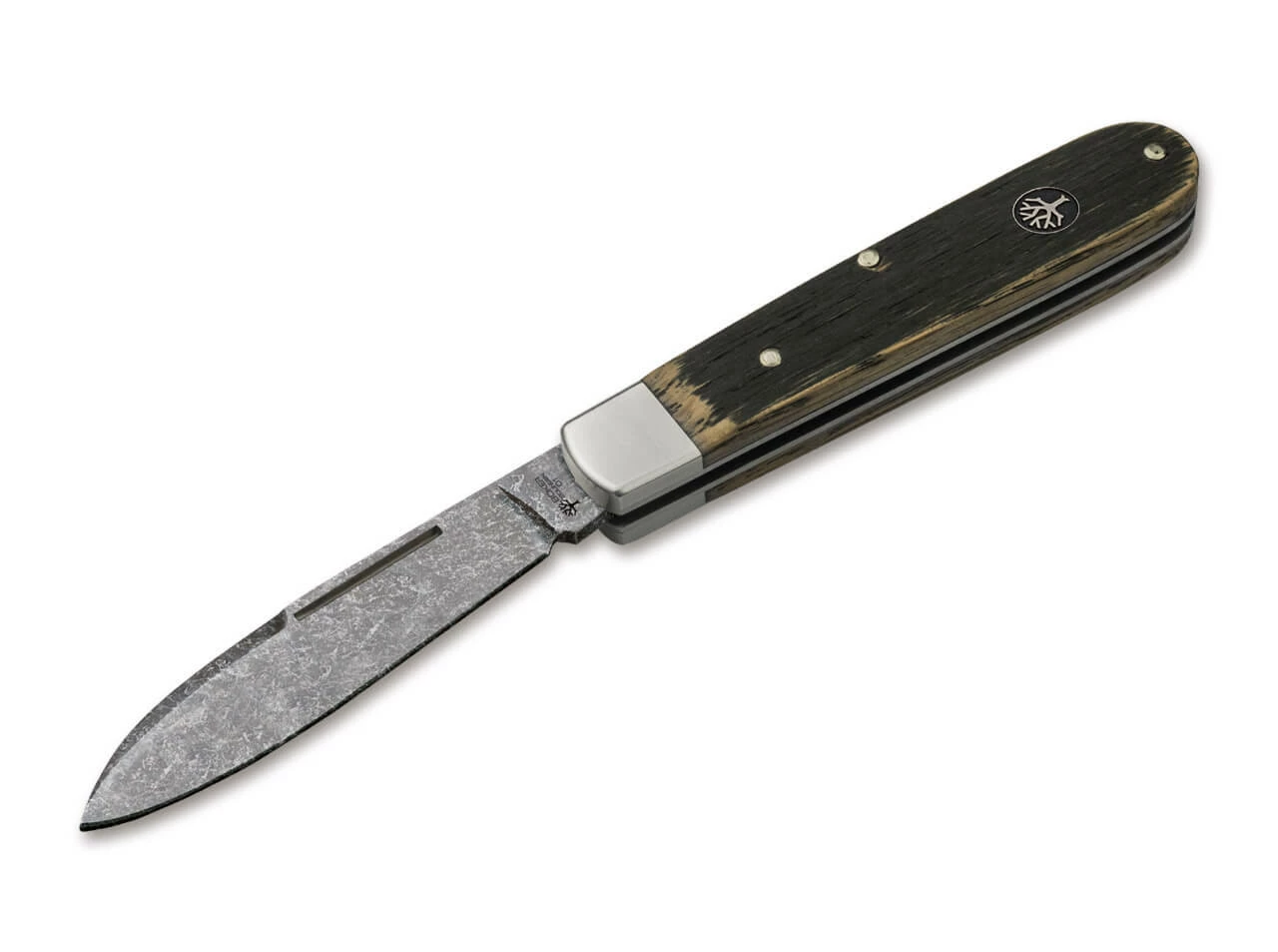 The Barlow Prime is clearly based on one of the knives of that time and is – just like in the past – completely manufactured in Solingen. Typical for this type of knife are the two nickel silver bolsters, which are a little shorter on this Barlow variant than on the American representatives of its kind. On the one hand, this has the advantage that the grain of the wood is better accentuated and on the other hand, the weight is reduced a little. The small plate with the Böker logo is also embedded in the handle.