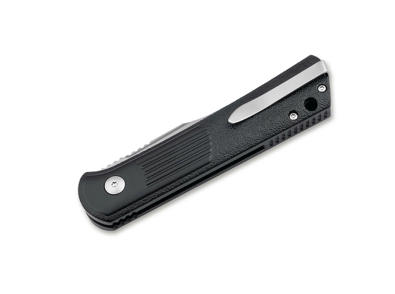 The black aluminum handle provides additional support for the thumb through the embedded push button and blade axle screw. The front handle part is smooth and refers to the stabilized alluvial soil, while the fine texture on the rear handle part symbolizes the flowing sediment. The recessed Tip-Up (r) Clip allows for a deep carry carry style and underscores the earthy character of the knife.