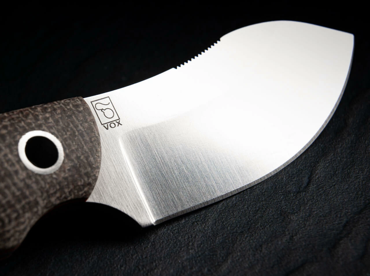 This full tang knife is made of solid D2 steel, which is considered to be extremely tough, durable and keeps the cutting edge sharp for a long time. Following the tradition of the classic Nessmuk knives, the blade has the typical upward sweep and a slight hump on the back of the blade towards the tip. This serves to make the tip of the knife a little easier to guide during hunting applications.