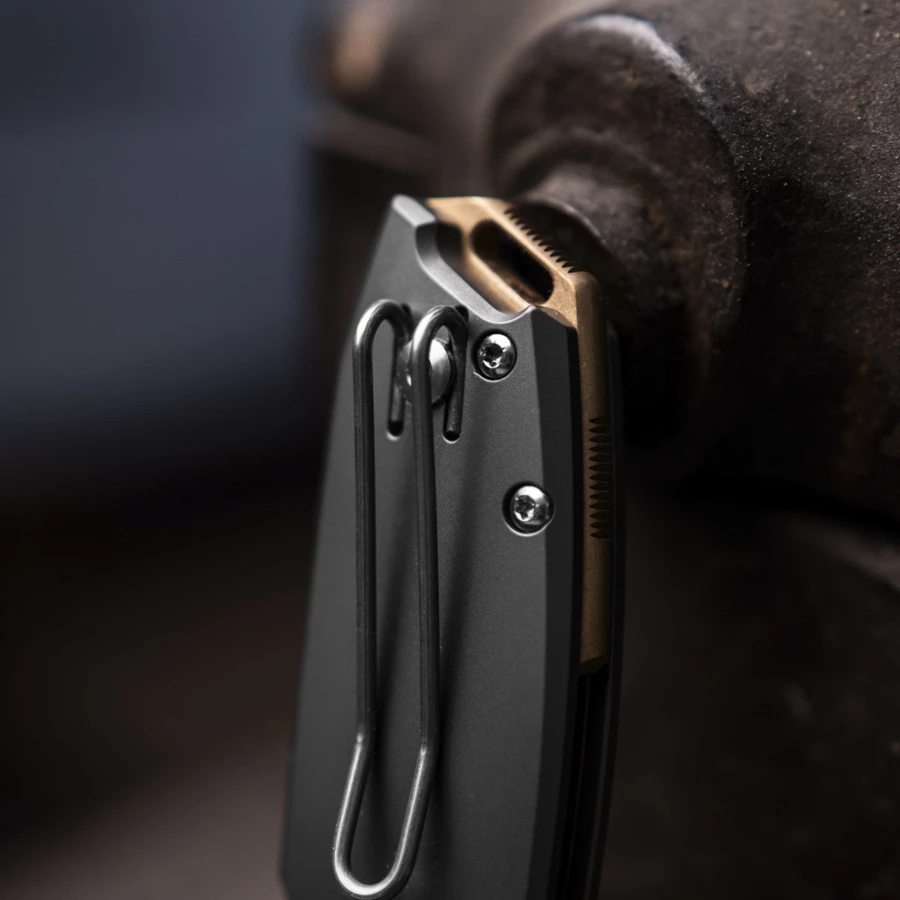 Denim Micarta feels and looks like denim. The brass backspacer even reminds you a bit of the buttons on your jeans. With the deep carry clip, the knife should match your blue jeans perfectly.