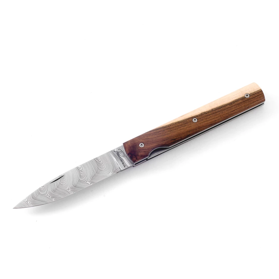 Perceval is based in Thiers France and has been making elegant pocket knives for everyday use or collecting since 1995. As with the classic version of the Les Francais (i.e. without the Damascus blade), the inspiration comes from a 17th century knife. This knife combines the practicality of a knife with the elegance of selected woods and the braided twist damascus.
