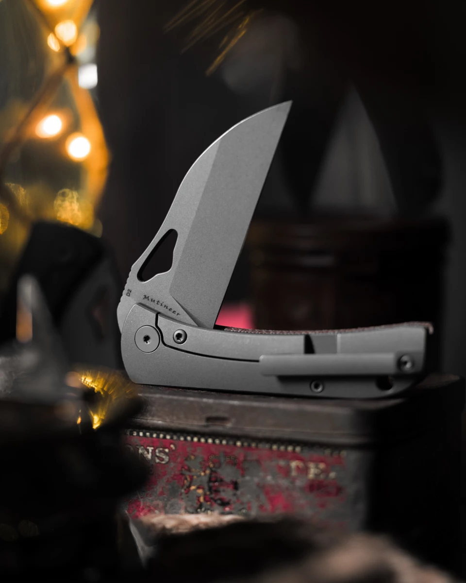 The Mutineer from Picaroon Tools is a handy little folder that has a wonderful EDC size. The handle is designed in such a way that it offers a very universal hand position, so that large as well as small hands are offered a great handling here. The matte titanium handle scales have a cool look that accentuates the modern appearance of this framelock folder (with steel insert, of course). The show side of this version is made of Micarta.