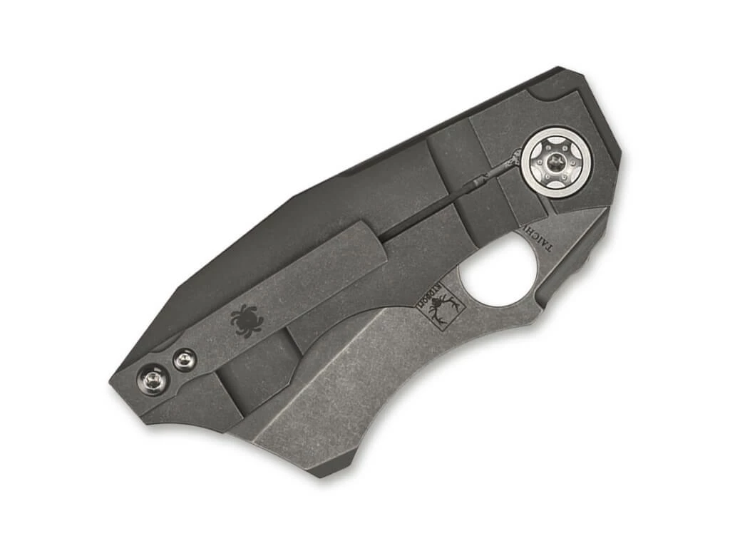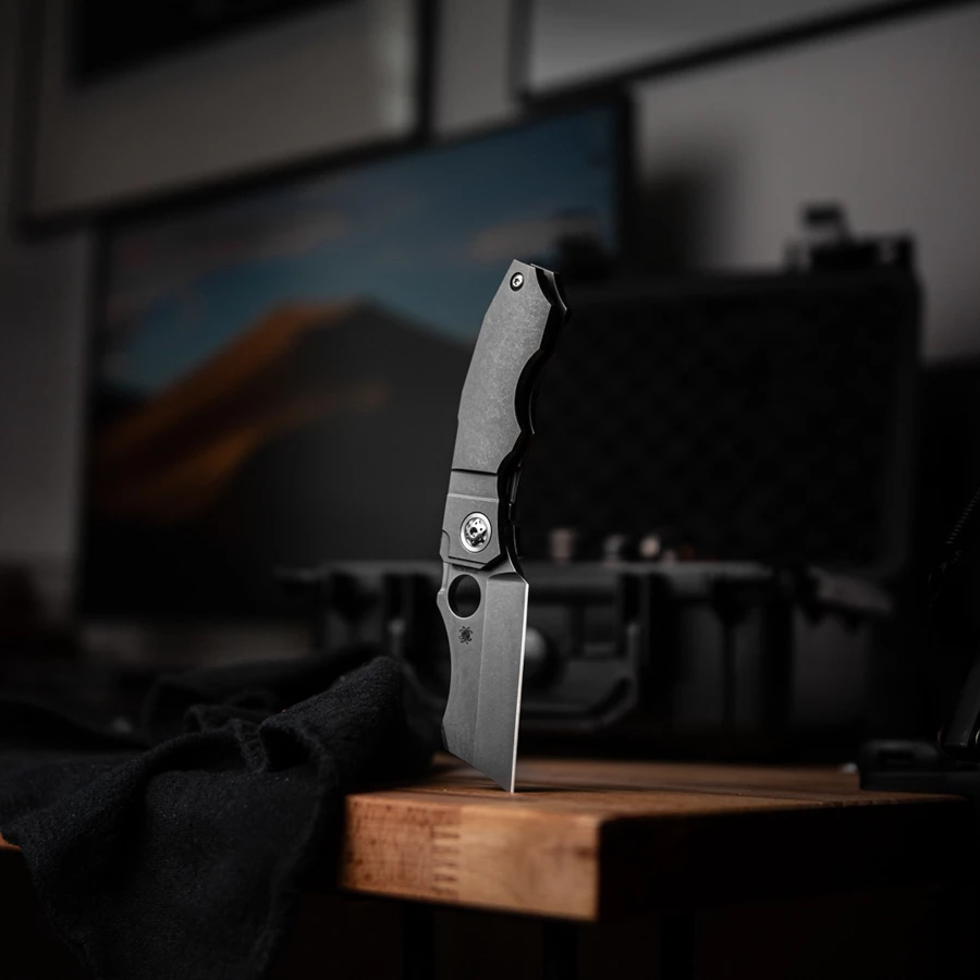 An absolutely exceptional knife for Spyderco is the Stovepipe. Maybe you already know David Rydbom? His “Bill The Butcher” custom knife, served as a template for this very beefy-looking Spyderco folding knife. The gray titanium handle scales have an angular look and form a closed optical unit with the hollow ground Cleaver blade made of CPM 20CV. The stonewash finish on the blade and handle has been matched to create a monochromatic look that is somewhat reminiscent of the lunar surface.