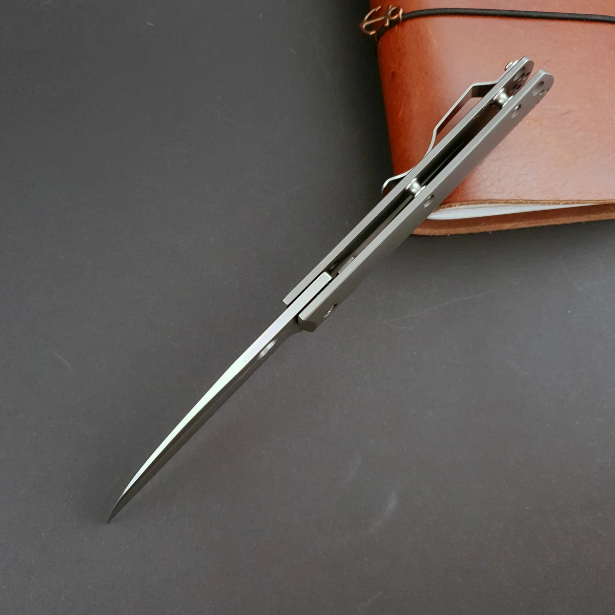 The hollow ground Wharncliff blade of the SwayBack is made of CTS® XHP stainless steel and has a stonewashed finish. The blade is held stable by solid titanium handle scales and a Reeve Integral Lock (frame lock).