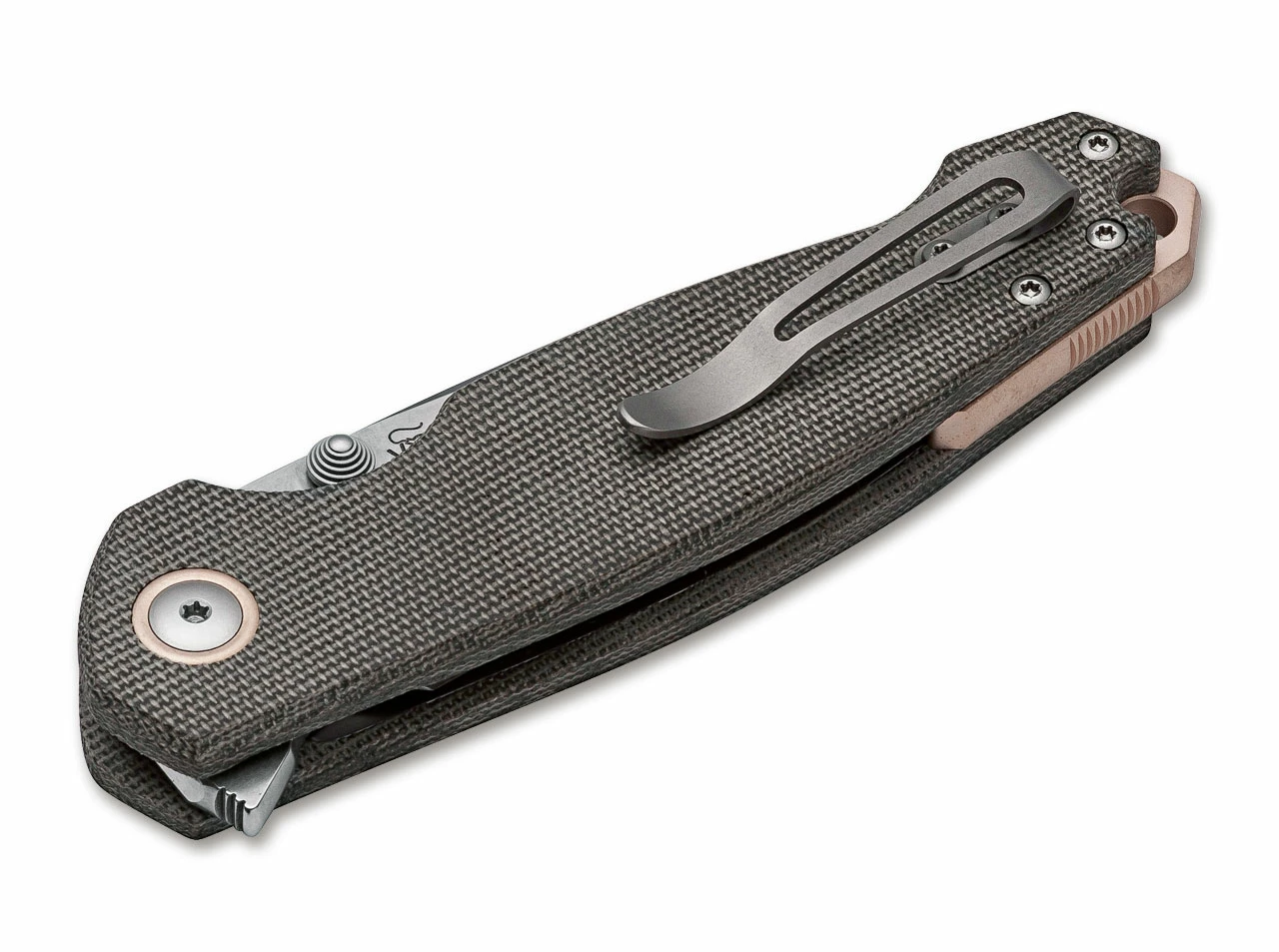 The handle is equipped with micarta scales, finished with a matte stonewash. Underneath the scales are steel liners, which also provide the liner lock. This locks the knife cleanly when open and can of course be easily operated with one hand. The blade, which runs on ball bearings, is opened via the small flipper tab that protrudes over the hilt or via the two thumb studs.