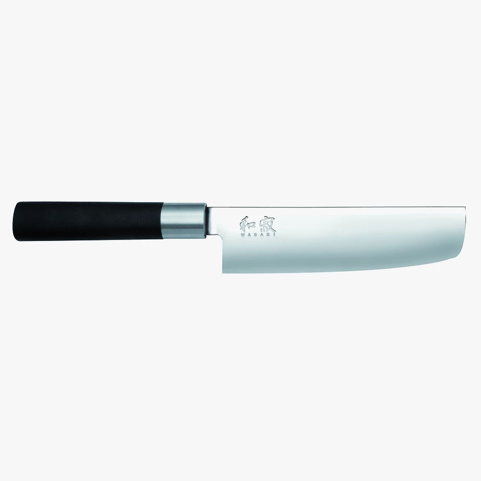 For preparing all kinds of vegetables. The traditional Japanese vegetable knife (Nakiri) is specially designed for cutting decorative ornaments of vegetables. Wasabi Black – polished blade, black handle: Developed in Japan, with a stainless polished steel blade with 58±1 HRC hardness, these knives will give your kitchen a distinctive, Far Eastern flair. For the Wasabi range, a handle was developed whose special combination of bamboo powder and polyphropylene offers optimal hygiene – also due to the naturally antibacterial effect of the bamboo components. In contrast to the traditional Japanese wooden handle, the black handle is not plugged, but completely encloses the blade, so that the blade is firmly connected to the handle and, on the other hand, no dirt is deposited – commercial kitchen suitability guaranteed.