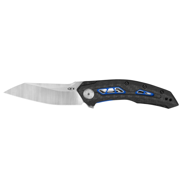 First, there’s the handle, which is made entirely of lightweight but ultra-tough carbon fiber. Embedded in the handle scales you will find blue anodized titanium liners, which are even visible through a milled out window in the carbon fiber. A secure lock is provided by the ZT-typical sub-framelock, which looks like a liner lock at first glance, but has all the features of a frame lock – of course including a steel insert in the lock interface to prevent wear and make your 0762 as durable as possible. Of course, the titanium lockbar as well as the clip is anodized in the typical ZT blue to bring a little color into the game.